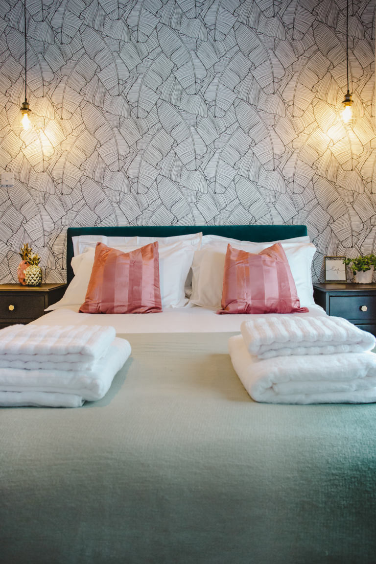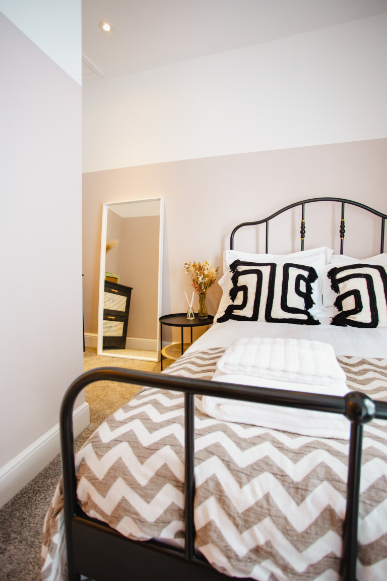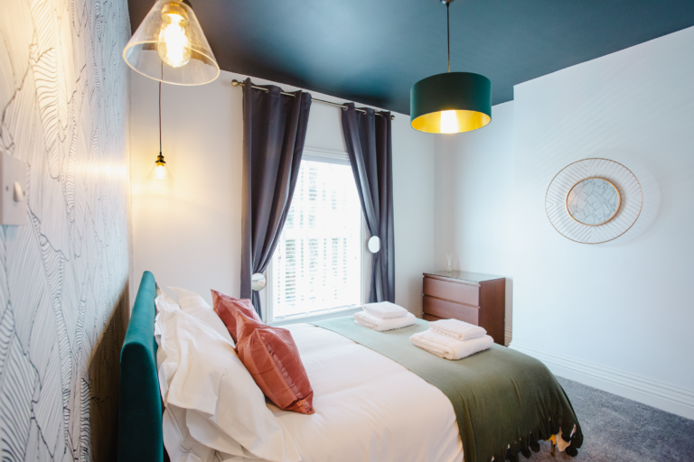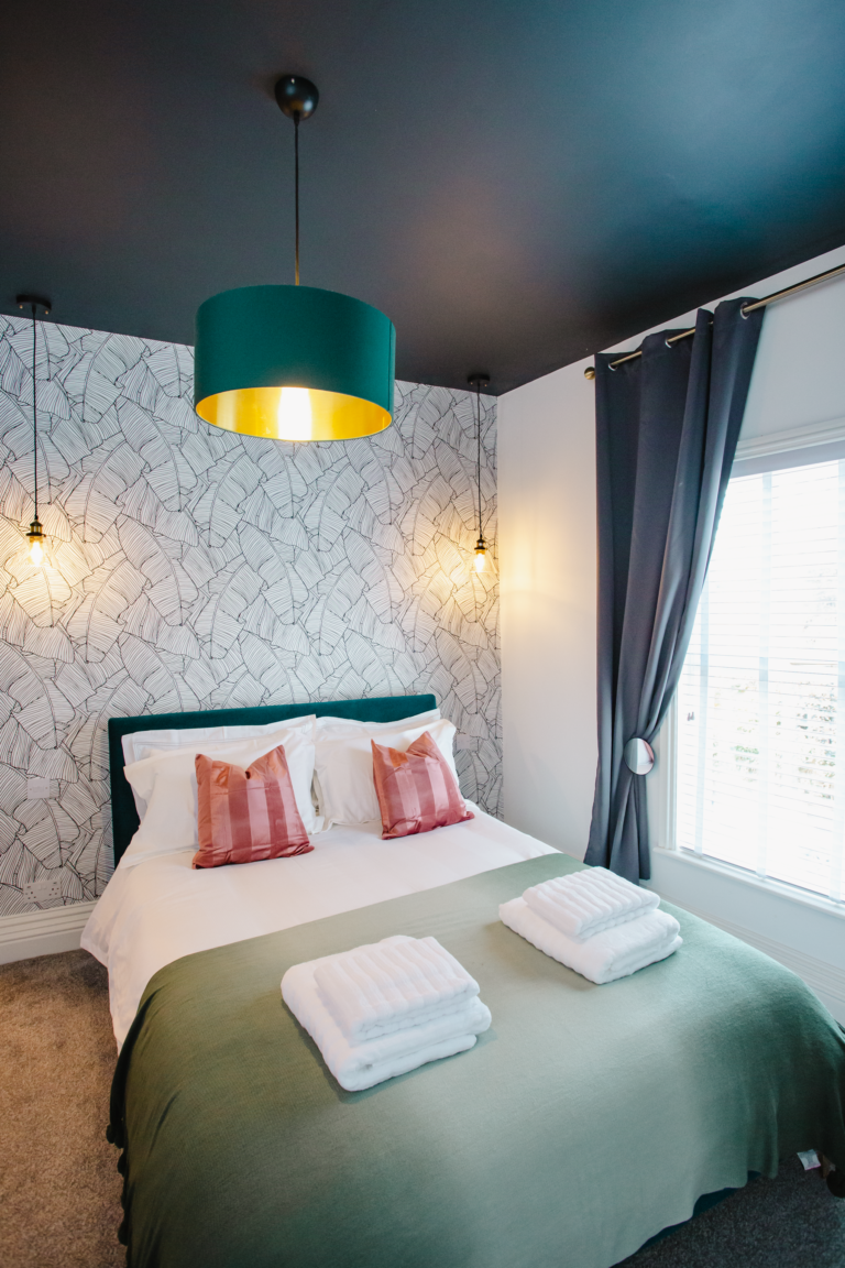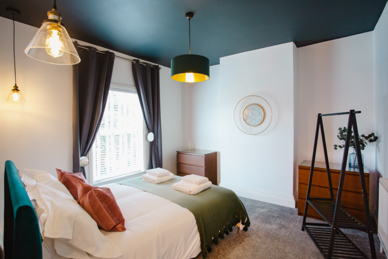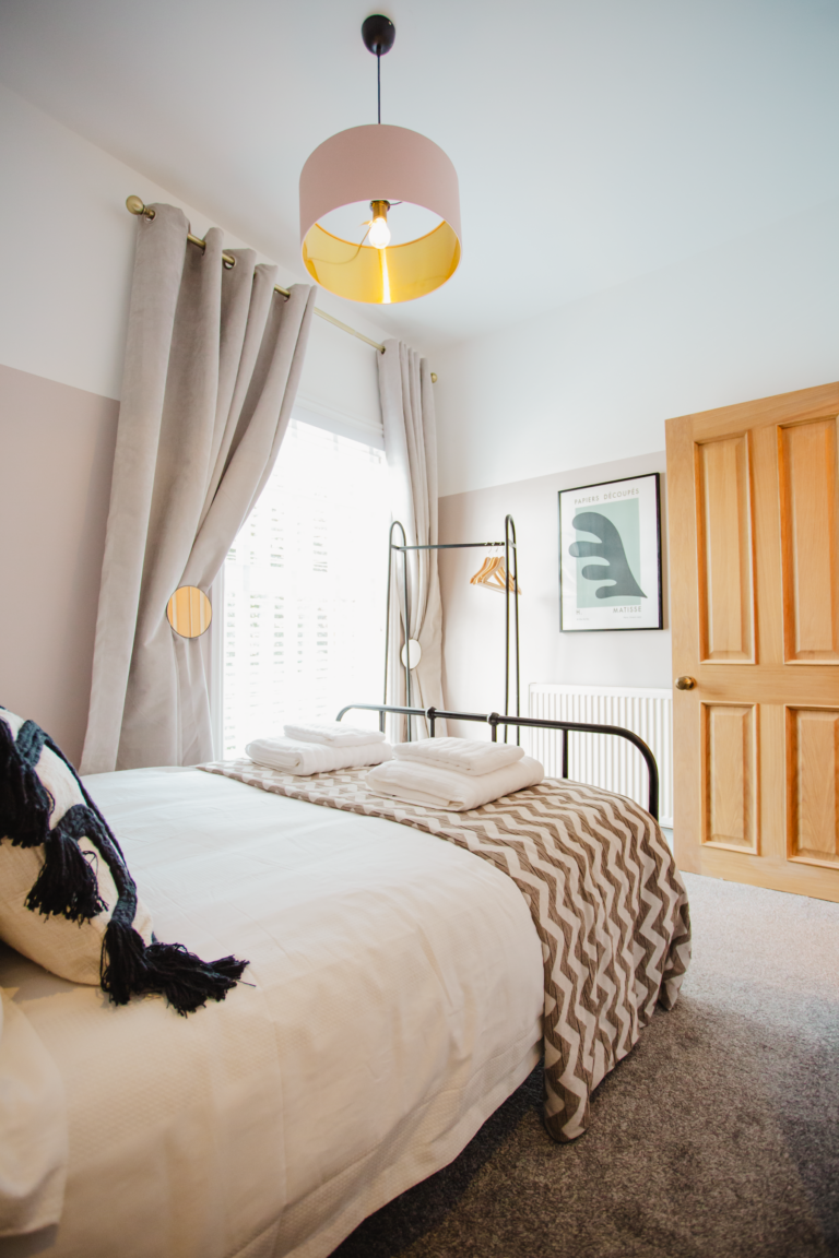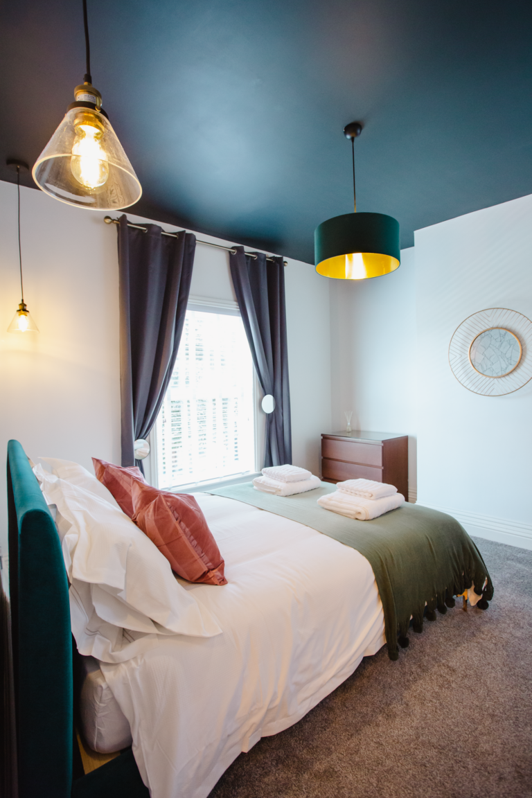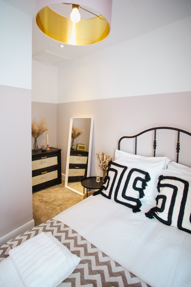 Within the home there are two large double bedrooms, that each have their own identity within the home and show how two personalities that are so strong and bold can live in harmony amongst one another. Firstly, we have one bedroom that has a dark and almost moody interior, with the painted ceilings and finishing accessories that replicate the colour from the top to the bottom of the room and ensure that comfort is key throughout. Walking within this room makes you feel like you are receiving a hug upon arrival! Whilst with the second bedroom there are far more earthly tones and a more minimalist approach yet has the subtle nod of the art deco/industrial identity in the furniture that is provided in both rooms.