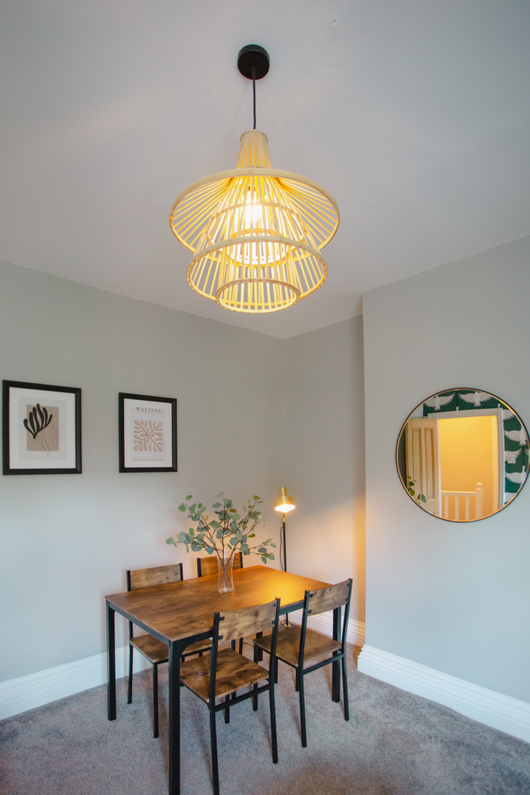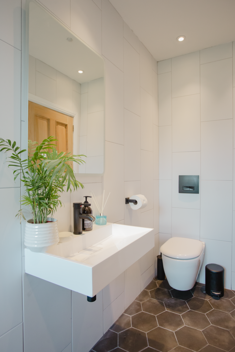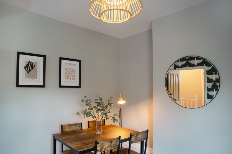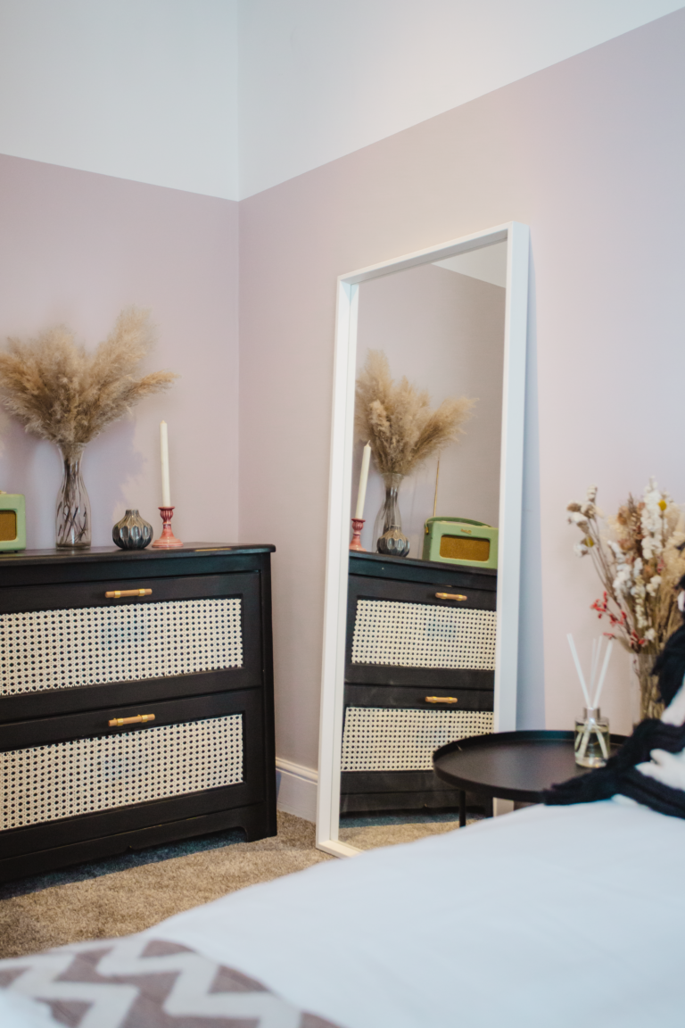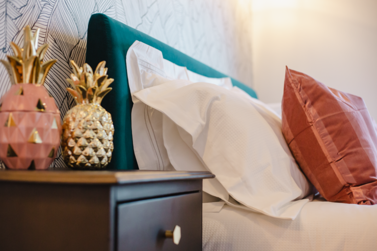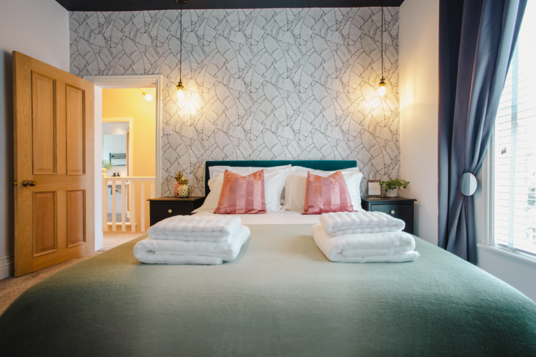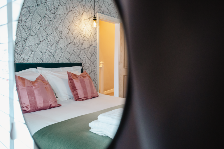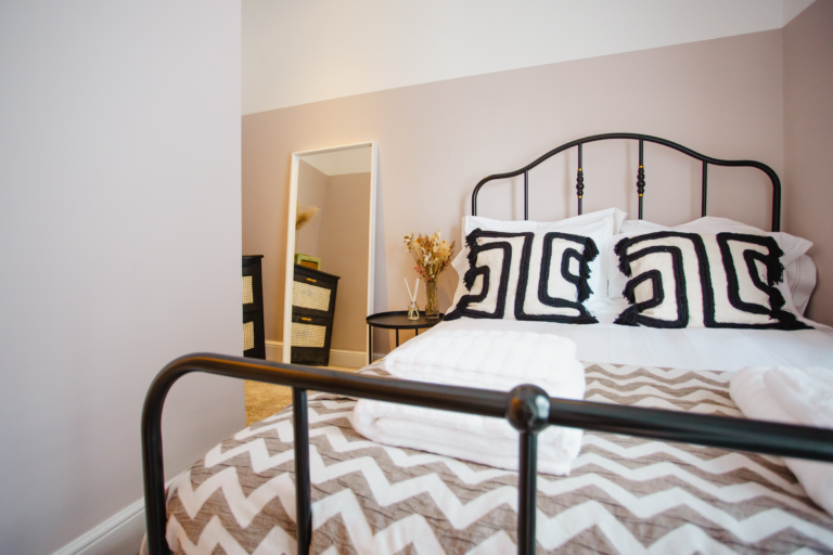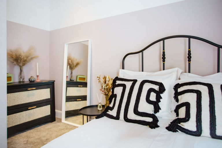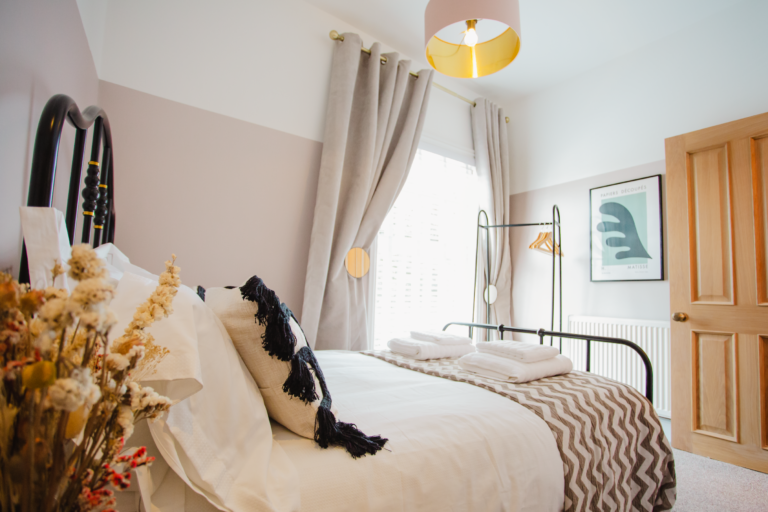 Within the home there are two large double bedrooms, that each have their own identity within the home and show how two personalities that are so strong and bold can live in harmony amongst one another. Firstly, we have one bedroom that has a dark and almost moody interior, with the painted ceilings and finishing accessories that replicate the colour from the top to the bottom of the room and ensure that comfort is key throughout. Walking within this room makes you feel like you are receiving a hug upon arrival! Whilst with the second bedroom there are far more earthly tones and a more minimalist approach yet has the subtle nod of the art deco/industrial identity in the furniture that is provided in both rooms.