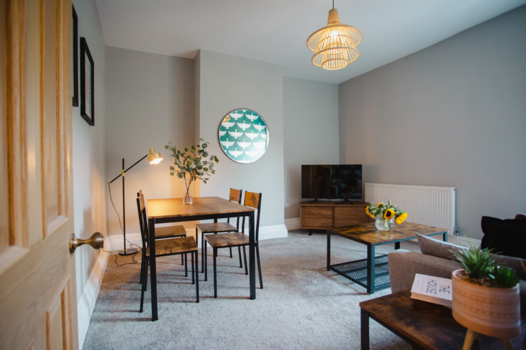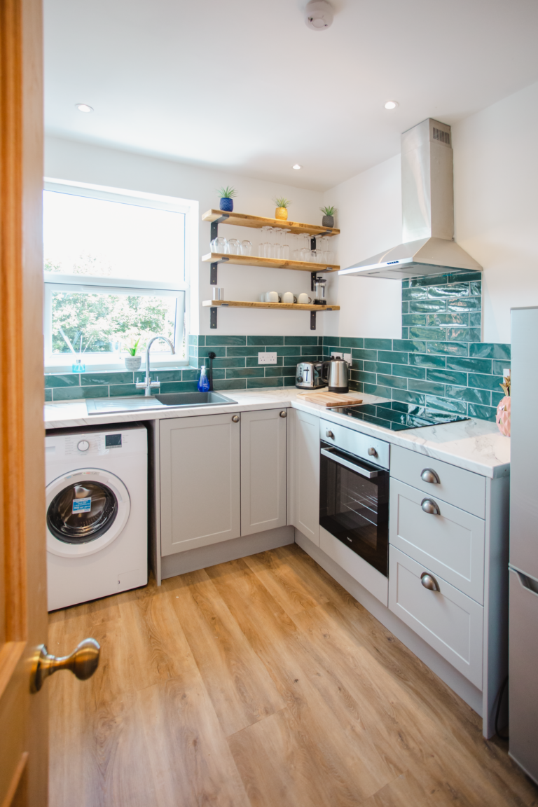 The communal spaces also provide not only excellent spaces that you can utilise but also have the same breath taking appearance that the rest of the home offers. With the industrial setting still being replicated within the kitchen shelving unit and the furniture within the living room, and the softer approach with the country style shaker doors for the kitchen units and the comfort from the plush sofa and country style doors that keep the character of this home alive. You will find the tones for the walls are replicated, creating a sense of unity within each room with the subtle palette replicating the darker green colours and greys whilst complimenting one another hand in hand, just like each room does throughout the apartment.